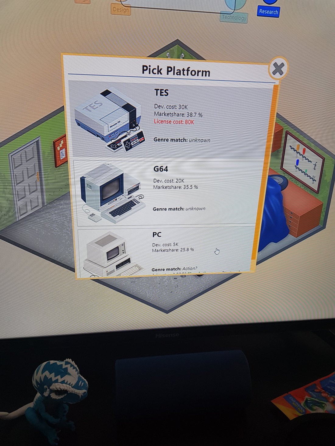 This game has a big variety of topics thankfully trying to reflect off real life as much as possible. You start out with 4 topics and unlock the rest using research points that you gain during development cycles each topic cost 10 research points if your lucky you have 1 good topic to use until you gain more. From all the times I’ve played the game offers 5 genres they are action, adventure, rpg, simulation and strategy and everything you do impacts your games in a big way so even though you will need to do a lot of experimenting to find good combos. Don’t be scared to go wild cause the game does help you out offering a little section called game report where it gives back advice on the game released telling you not only if the combo you picked out was good but if the PC or console you released it on was a good match and trust me there are games that work well on one and not the other.